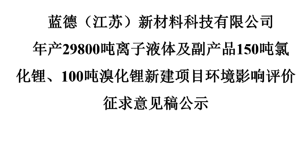 藍德(江蘇)新材料科技有限公司 年產29800噸離子液體及副產品150噸氯化鋰、100噸溴化鋰新建項目環境影響評價征求意見稿公示